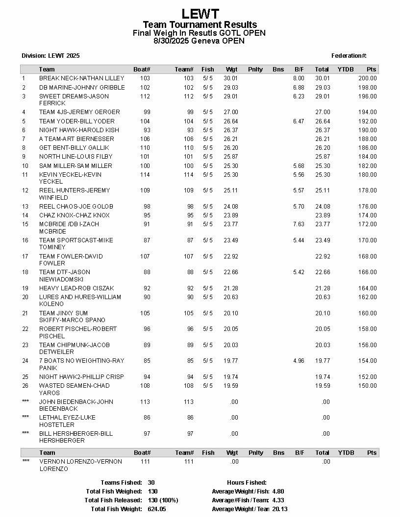 BIg Fish Friday & Geneva GOTL Open Recap ~ 8.29.25 RESULTS