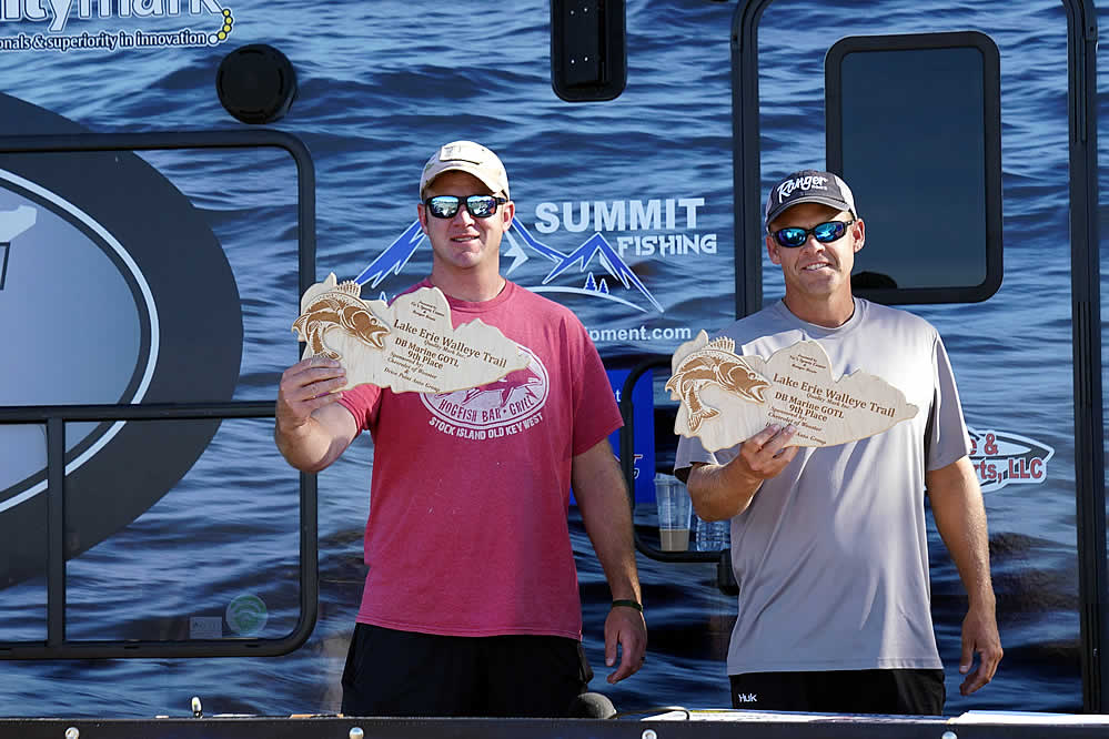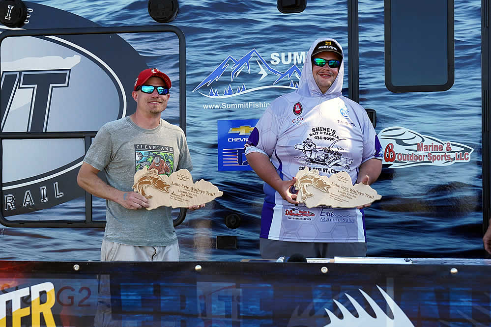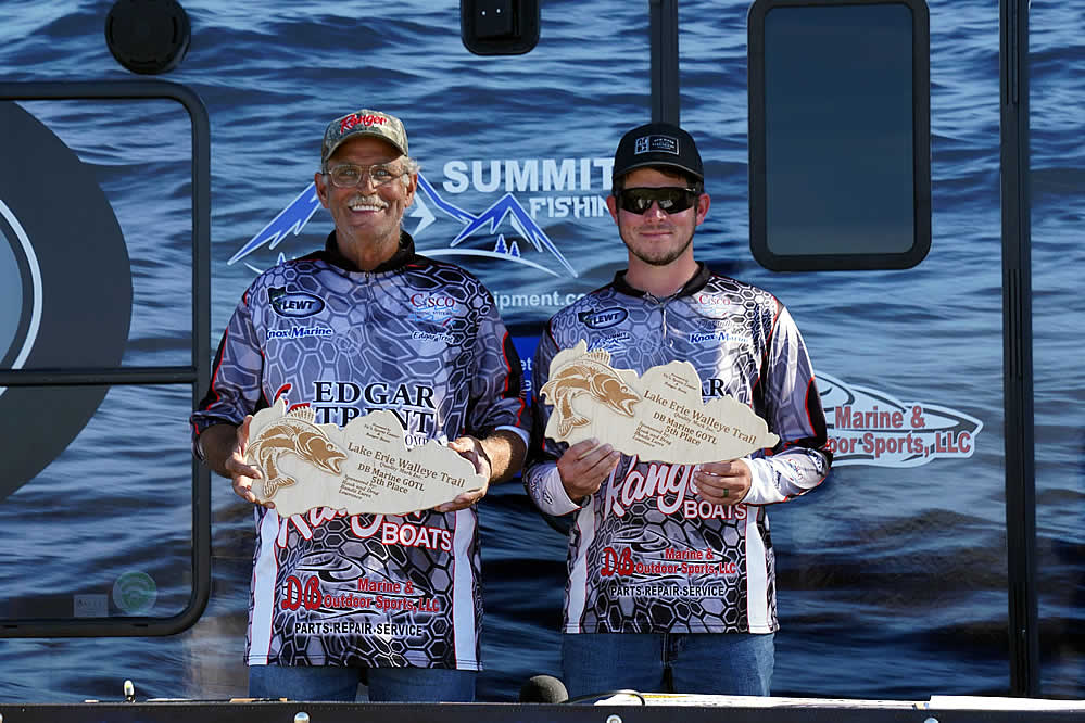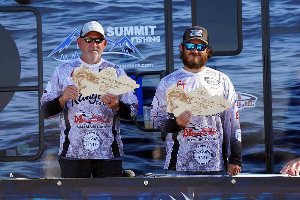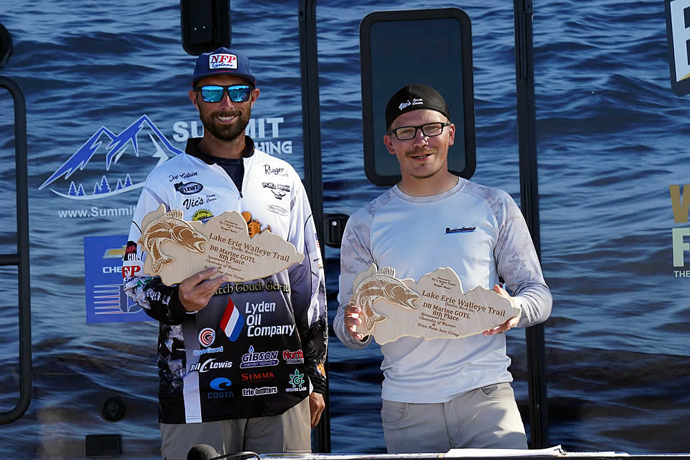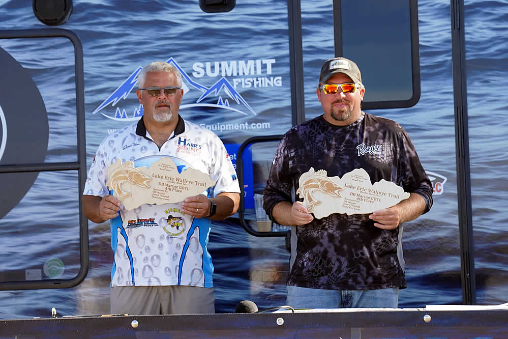 Just sitting out of the money are notable favorites in the Lake Erie Walleye Trail: Gary and Alex Kisel in 15th place, Kyle Kokanovich and Charlie Klaus in 13th place, Gary and Nicholas Zart in 12th place, and Steve Hendricks and Brian Ulmer in the bubble spot just out of the money in 11th place.