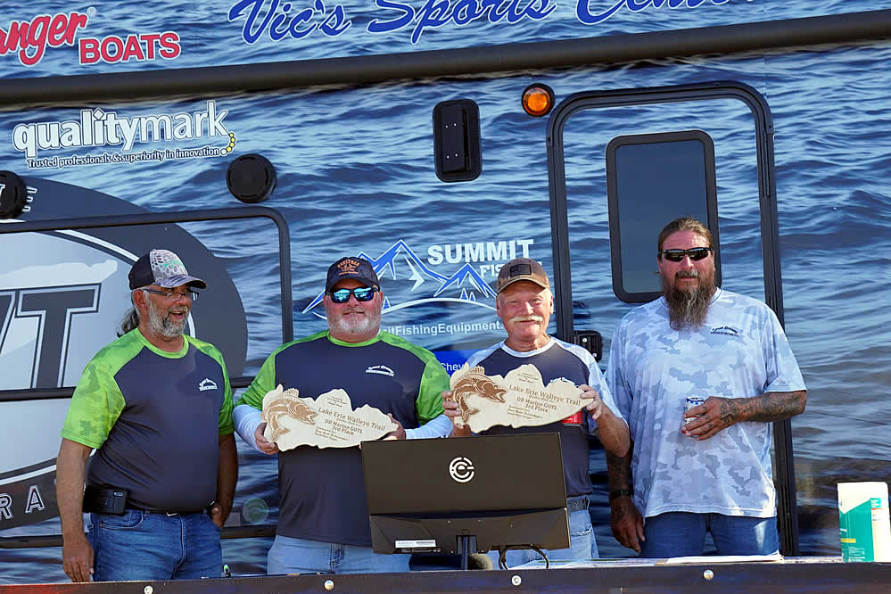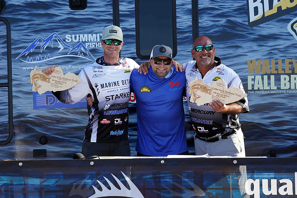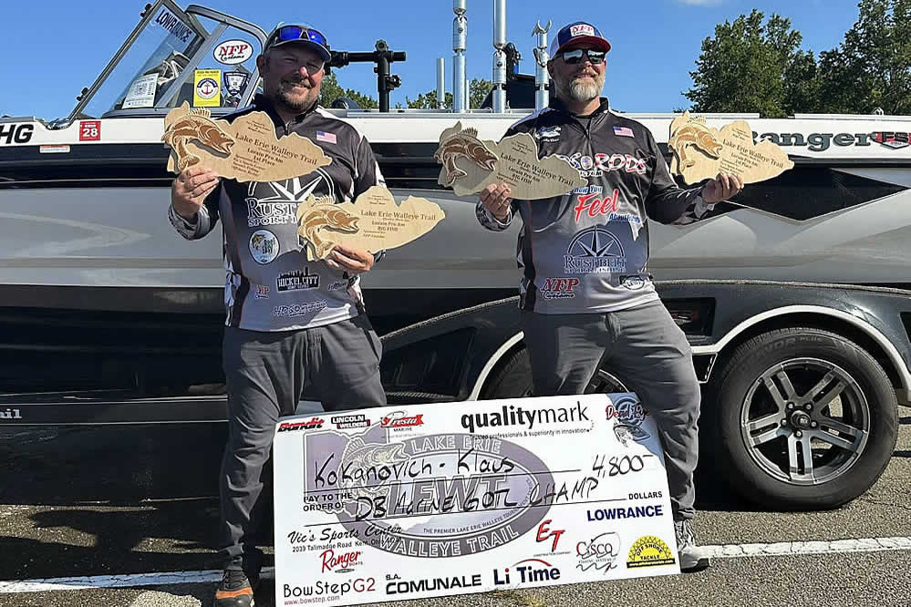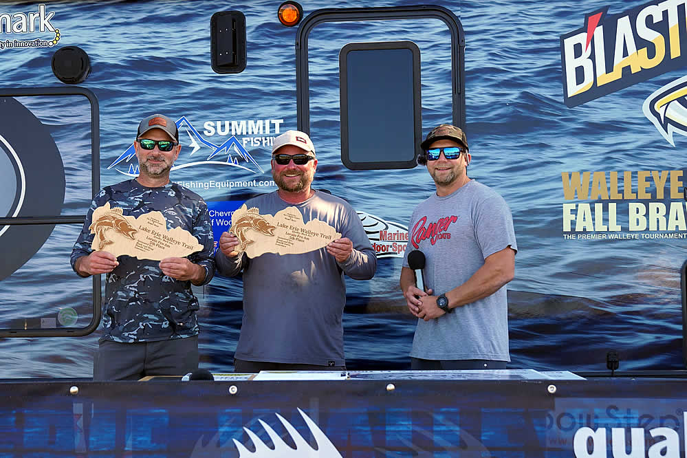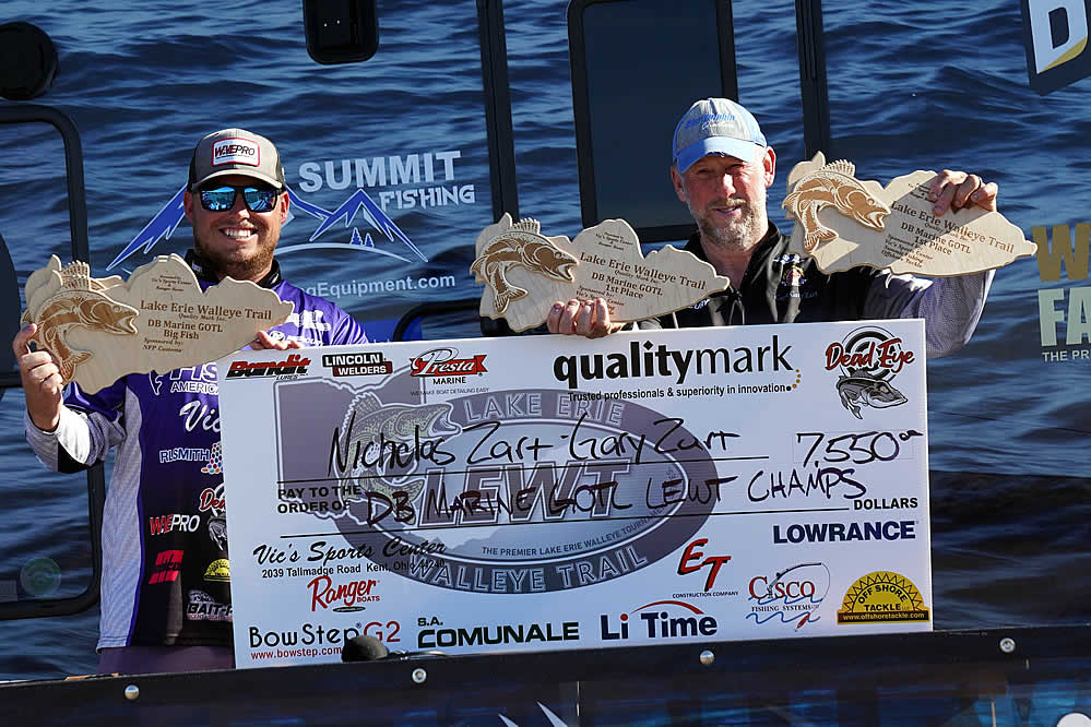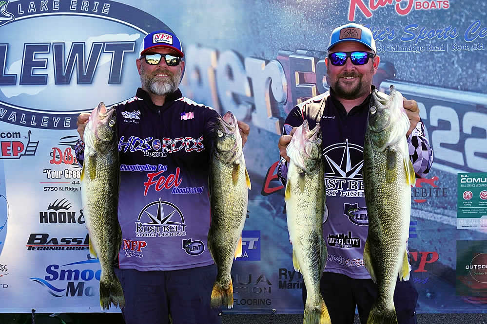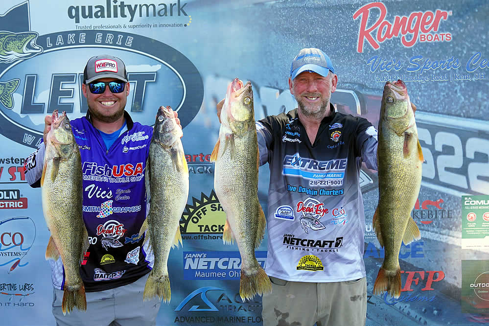 Just sitting out of the money are notable favorites in the Lake Erie Walleye Trail: Gary and Alex Kisel in 15th place, Kyle Kokanovich and Charlie Klaus in 13th place, Gary and Nicholas Zart in 12th place, and Steve Hendricks and Brian Ulmer in the bubble spot just out of the money in 11th place.